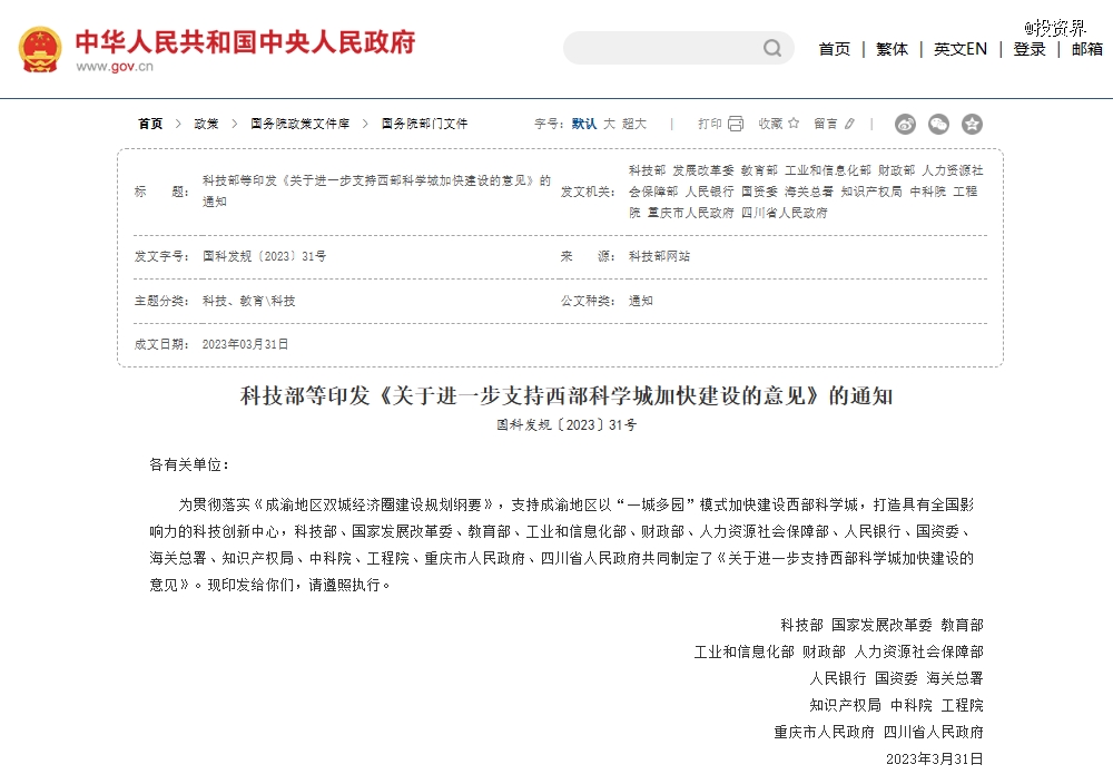 今年4月,科技部等印发《关于进一步支持西部科学城加快建设的意见》,明确提出支持成渝地区以“一城多园”模式加快建设西部科学城。中国(绵阳)科技城则是先行启动区之一。