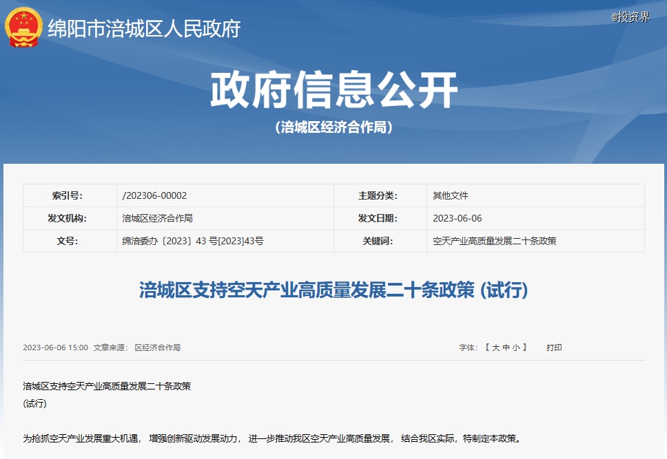 在“涪城一号”成功发射入轨当日,绵阳市涪城区发布了《关于加快空天产业高质量发展的实施意见》《涪城区支持空天产业高质量发展二十条政策(试行)》,指出设立了规模达50亿元的空天发展产业基金,将从企业落地、研发创新、人才引进等五个方面形成全链条、全要素的创新政策体系,重点发展以火箭、卫星、飞行器、数据运营中心为核心的航天产业,加快建设千亿空天产业集群。