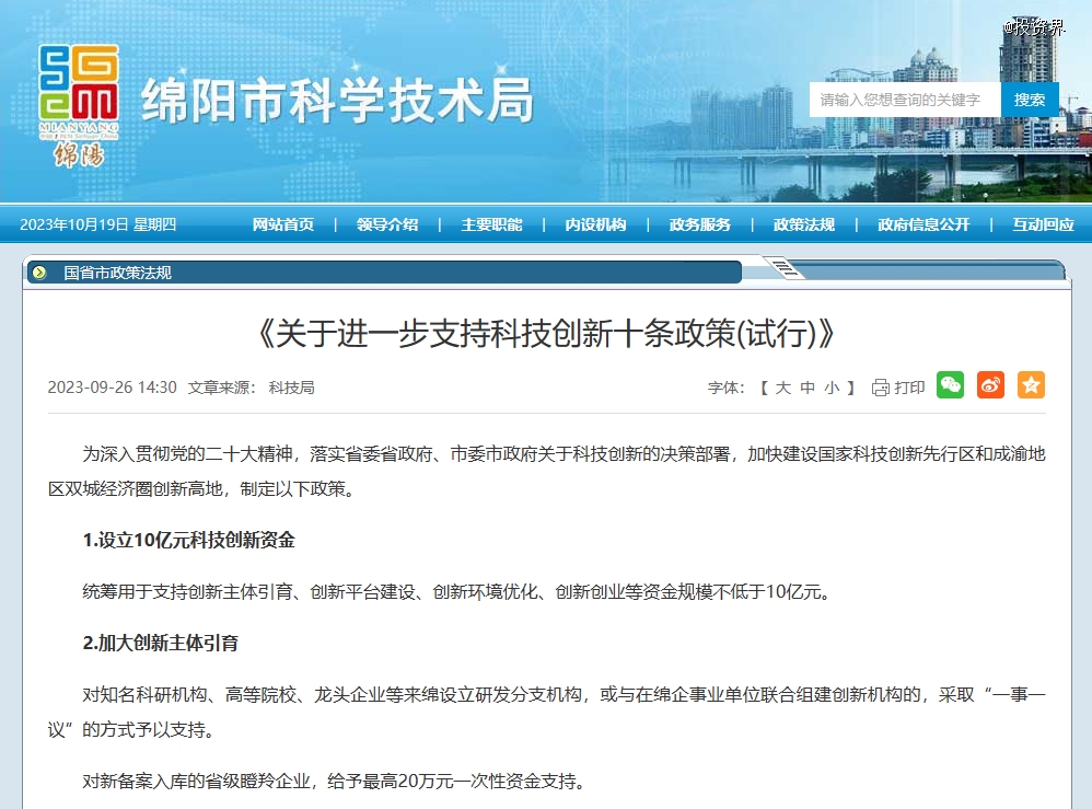 今年9月,绵阳出台《关于进一步支持科技创新十条政策(试行)》等政策,设立10亿元科技创新资金,对知名科研机构、高等院校、龙头企业等来绵设立研发分支机构,或与在绵企事业单位联合组建创新机构的,采取“一事一议”的方式予以支持。