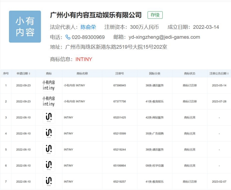 根据天眼查,广州小有内容互动娱乐有限公司持有INTINY商标。该商标的申请日期为2022年6月10日和2022年9月23日。其中,“小有内容INTINY”的“38类-通讯服务”和“41类-教育娱乐”显示商标状态为“商标已注册”,注册公告日期分别为2023年5月14日和2023年7月28日。“INTINY”的“41类-教育娱乐”的商标状态显示为“商标已注册”,注册公告日期为2023年2月7日。除此之外,其余申请均显示为“商标无效”。