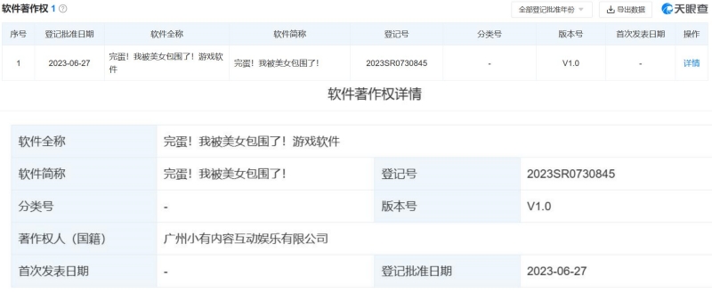 天眼查还显示,广州小有内容互动娱乐有限公司持有软件著作权1项,软件全称为“完蛋!我被美女包围了!游戏软件”,软件简称“完蛋!我被美女包围了!”。该软件著作权登记批准日期为2023年6月27日。