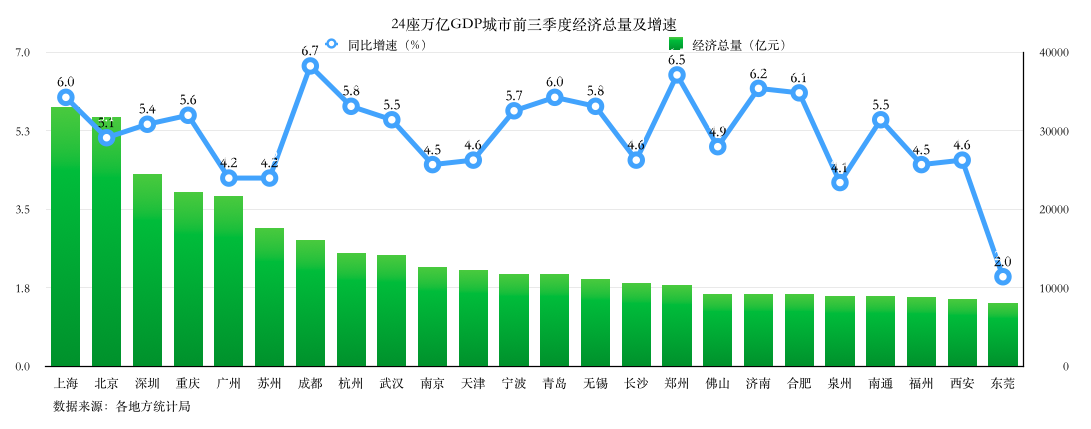 目前,24座万亿GDP城市前三季度经济成绩单悉数出炉。京沪双双超3万亿元,重庆经济第四城的地位日益巩固。13座城市经济增速高于5.2%的全国平均水平,成都名列第一,郑州、合肥紧随其后。