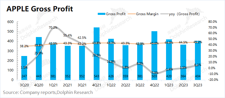 1.3 经营利润:2023财年第四季度(即3Q23)苹果公司经营利润270亿美元,同比增长8.3%。苹果公司本季度经营利润的增加,主要是毛利率提升所致。