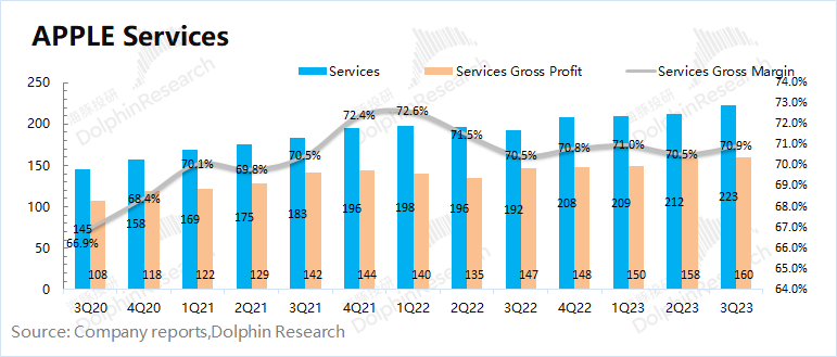 从环比来看,Mac业务环比有所回升。海豚君认为整体PC行业经历长时间的去库存后,当前已经开始逐步回暖。而苹果Mac业务本季度的表现,也是疲软阶段的相对正常表现。