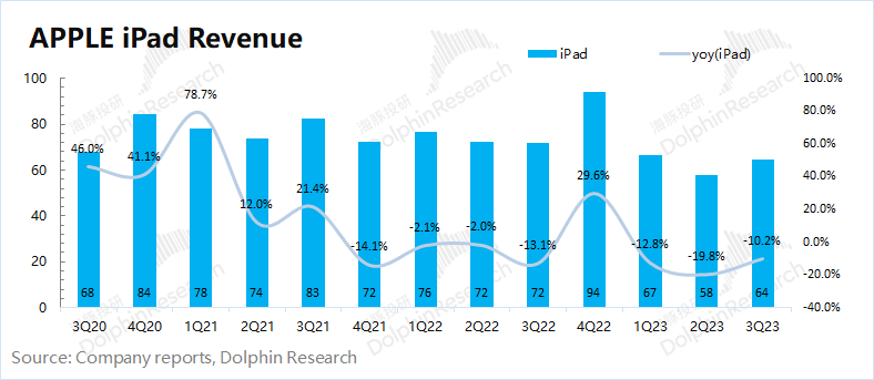 2023财年第四季度 iPad 业务收入64亿美元,同比下滑10.2%,略好于彭博一致预期(61.4亿美元)。iPad业务的当前下游整体需求仍然偏弱,导致该业务收入持续低迷。