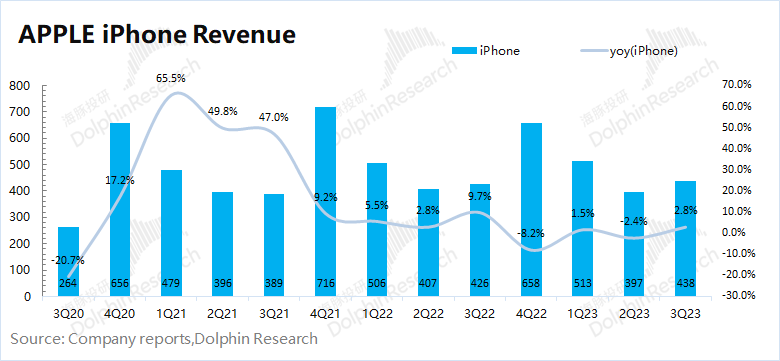 2023财年第四季度 iPhone 业务收入438亿美元,同比增长2.8%,基本符合彭博一致预期(436.5亿美元)。本季度全球手机市场出货量同比基本持平,而公司手机业务略好于整体市场表现。