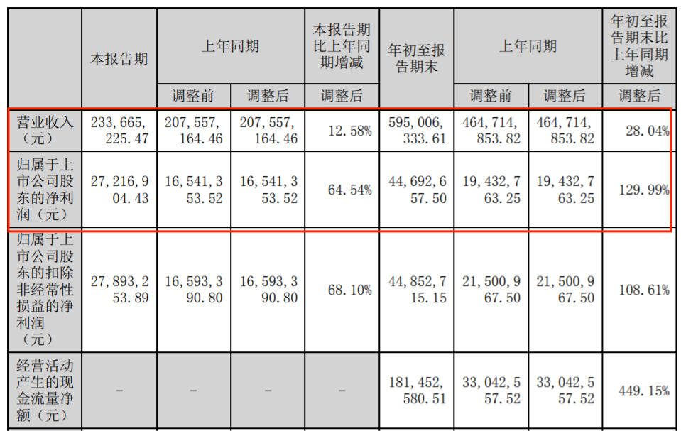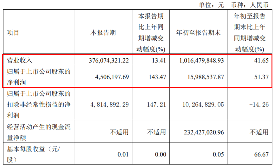 2023年Q3,该公司实现营业收入3.76亿元,同比增长13.41%,净利润450.62万元,同比增长143.47%。根据半年报披露信息,公司今年业绩向好的主要原因是沐邦高科顺应市场变化、行业及政策趋势,努力发展和经营光伏业务。