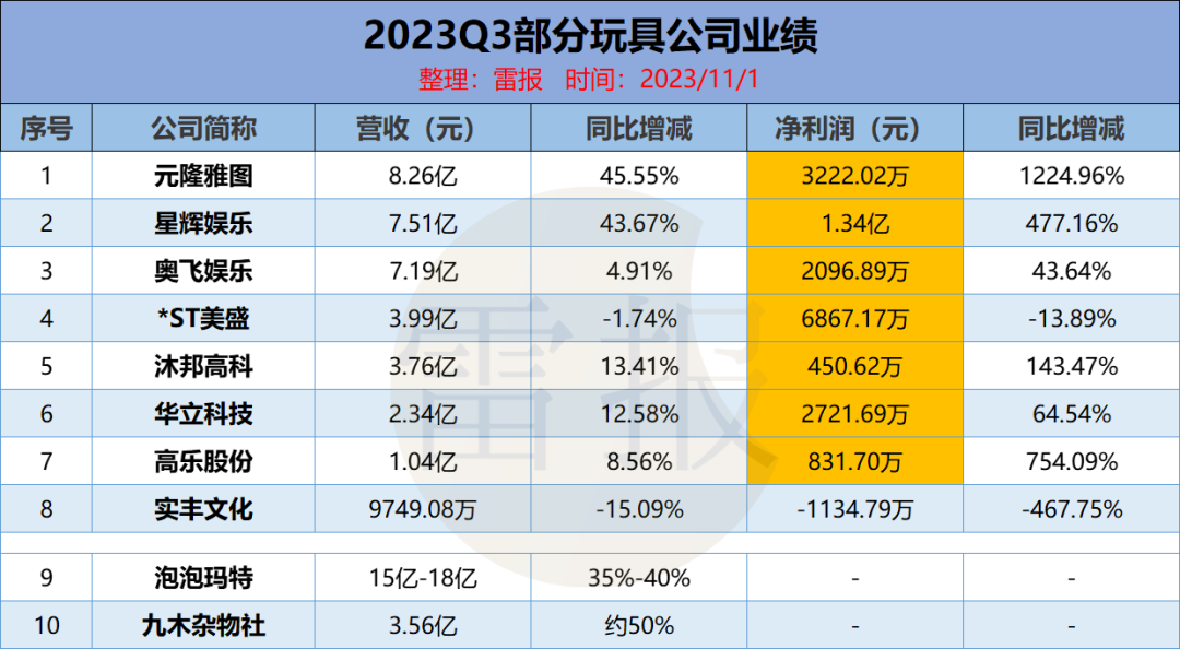 近期,各大上市玩具公司相继公布了2023年Q3业绩。雷报统计了目前已公布业绩的10家玩具公司/品牌的上半年收入情况: