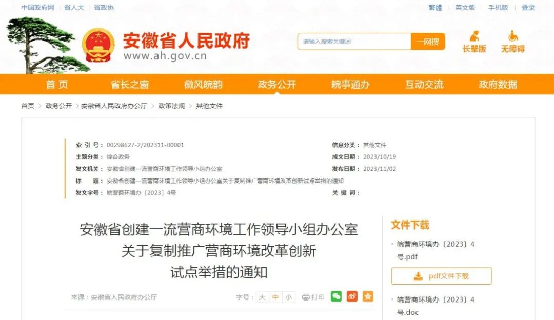 11月2日,安徽省人民政府网站发布“安徽省创建一流营商环境工作领导小组办公室关于复制推广营商环境改革创新试点举措的通知”。