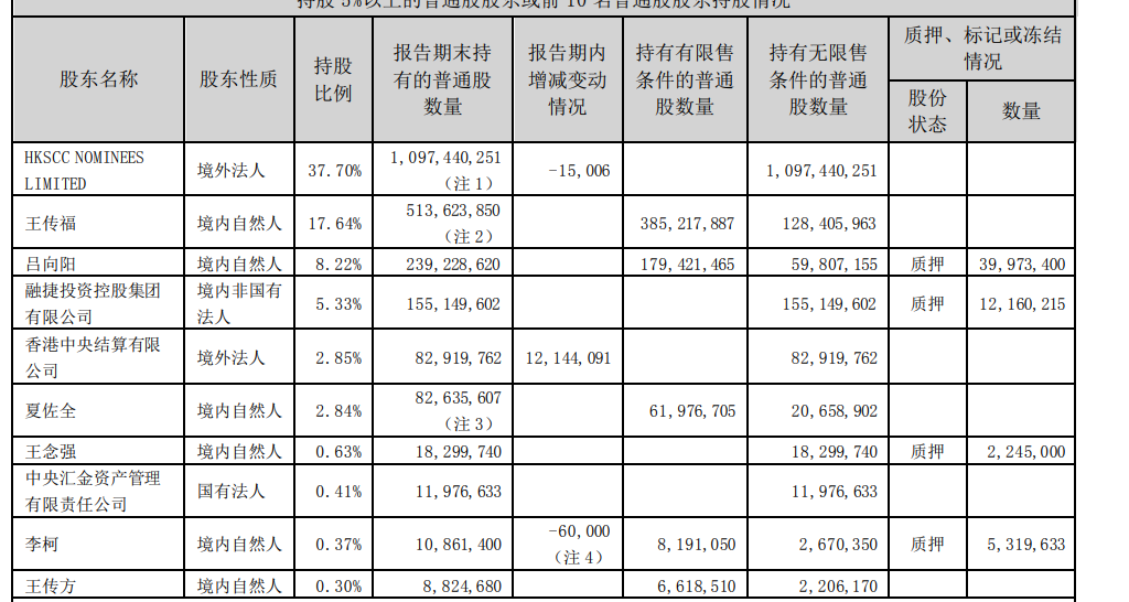 比亚迪最新披露的三季度报显示,财报披露,HKSCC NOMINEES LIMITED为其第一大股东,持股比例37.70%,约持10.97亿股,第二和第三大股东分别为王传福和吕向阳。