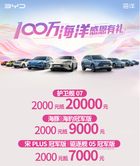 11月1日,“比亚迪汽车”官方微博发文称,将在11月1日至11月30日推出“100万海洋感恩有礼”活动,对五款车型推出优惠活动,其中护卫舰07有2000元抵20000元活动,海豚和海豹冠军版2000元抵9000元,宋PLUS冠军版和驱逐舰05冠军版2000元抵7000元。此外,还有驱逐舰05、秦PLUS EV 2023冠军版等车型也打出价格优惠。