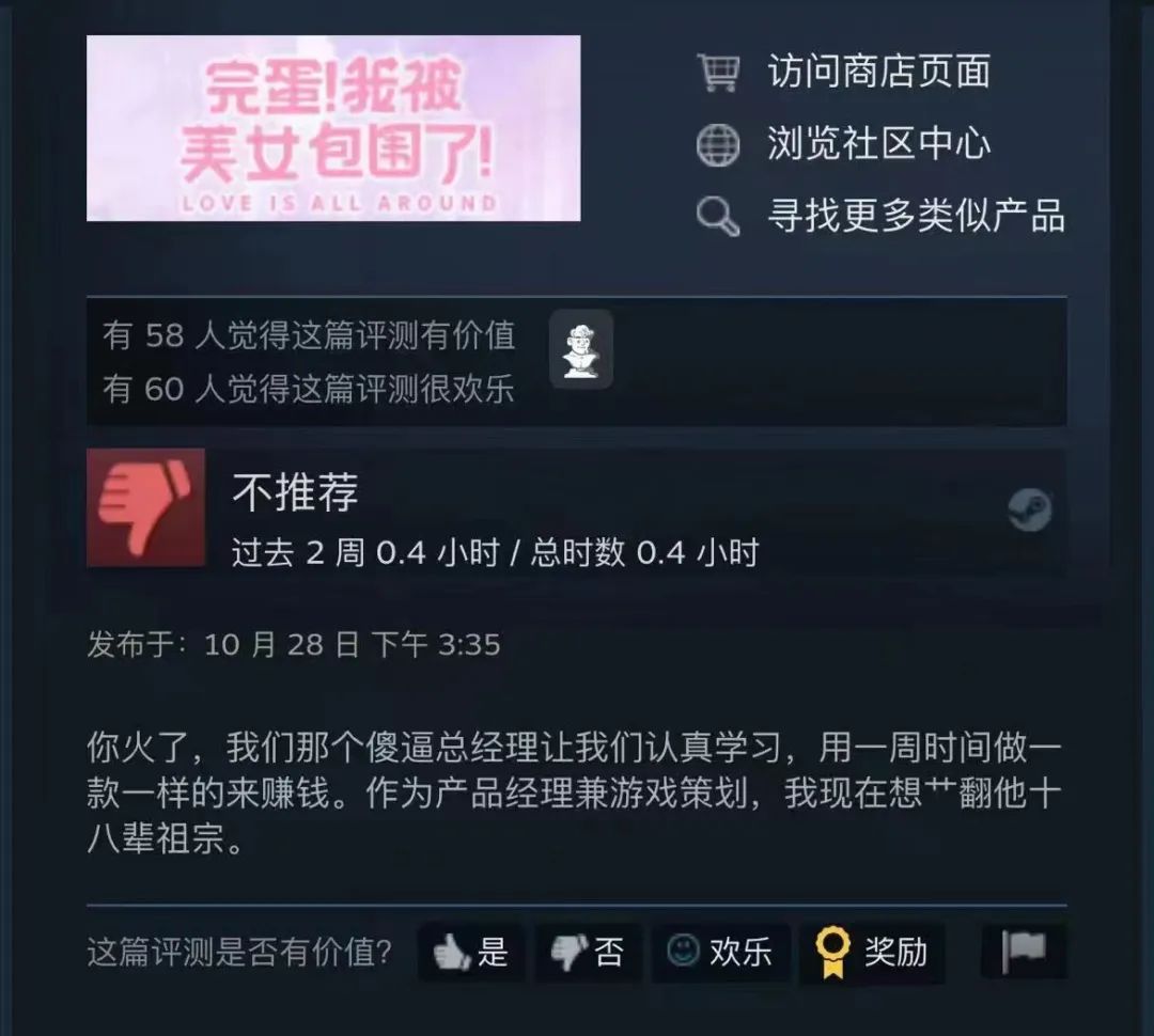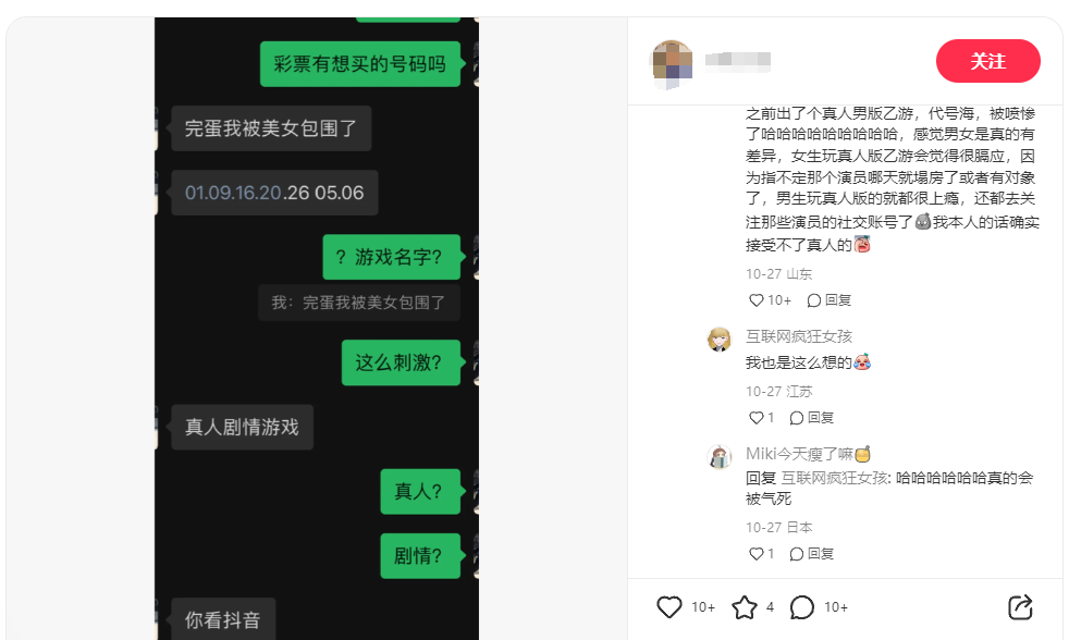 大家热烈讨论造就这份“奇迹”的原因。在社区,网友给出了千百种答案,有的指向主播试玩的“带货效应”,更多则指向现实生活中男性的“情感空缺”。还有从业者表示“很多时候看命”——相似题材,有些火了,有些做得更好就是不红。