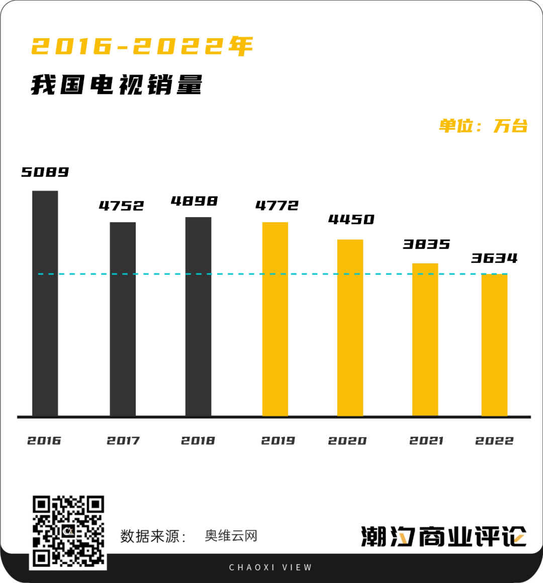 我们将时间线拉长一些便会发现,从2016年开始,我国电视销量就开始走下坡路了。彼时,全年销量高达5089万台。到了2022年,我国电视销量只有3634万台,5年内减少了将近1500万台。