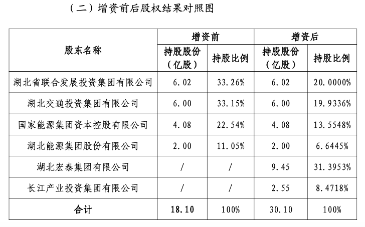 原来的第一大股东湖北省联合发展投资集团有限公司持股比例降至20%,湖北交通投资集团有限公司持股降为19.9%%;国家能源集团资本控股有限公司和湖北能源集团股份有限公司分别持股13.55%和6.64%。