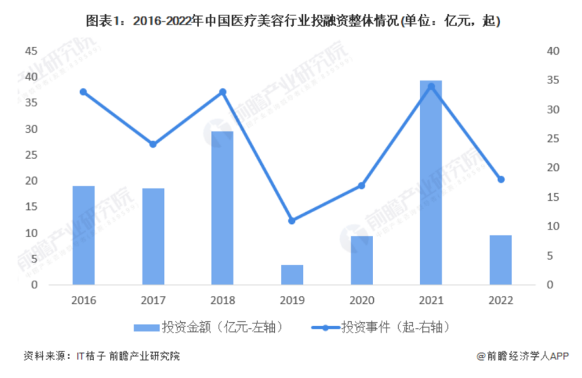 根据IT桔子数据库,中国医疗美容投融资金额和数量呈现波动变化。2018年和2021年投融资事件数量均较高,分别为33起和34起,但2021年投融资总金额最高,为39.27亿元。2022年,中国医疗美容行业发生18起投融资事件,金额为9.56亿元。