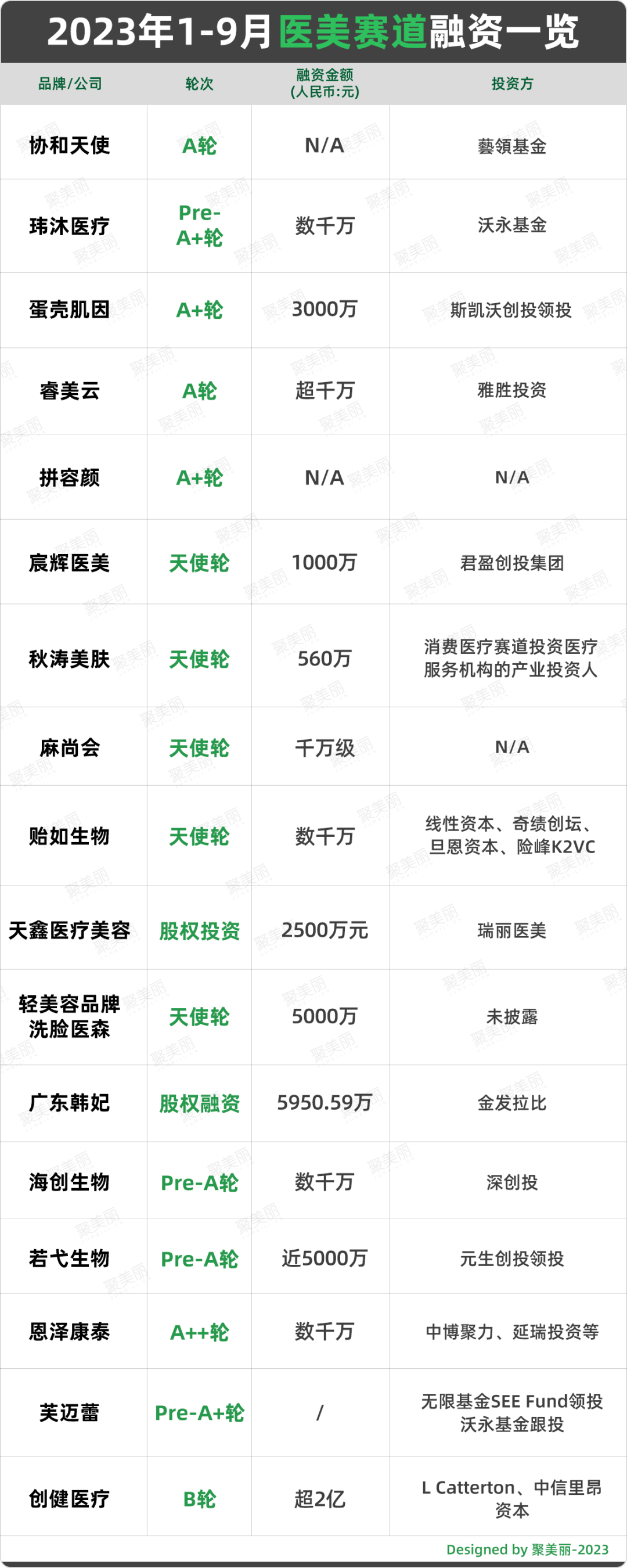 区别于美妆赛道遇冷,自去年以来,轻医美一直是资本流向的掘金热土,如今更受到市场欢迎。根据聚美丽不完全统计,2023年1-9月医美赛道融资情况如下: