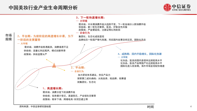根据中信证券资料,从时间维度来看,美妆行业大概率会经过四个发展阶段(以市场规模增长速度进行衡量)。