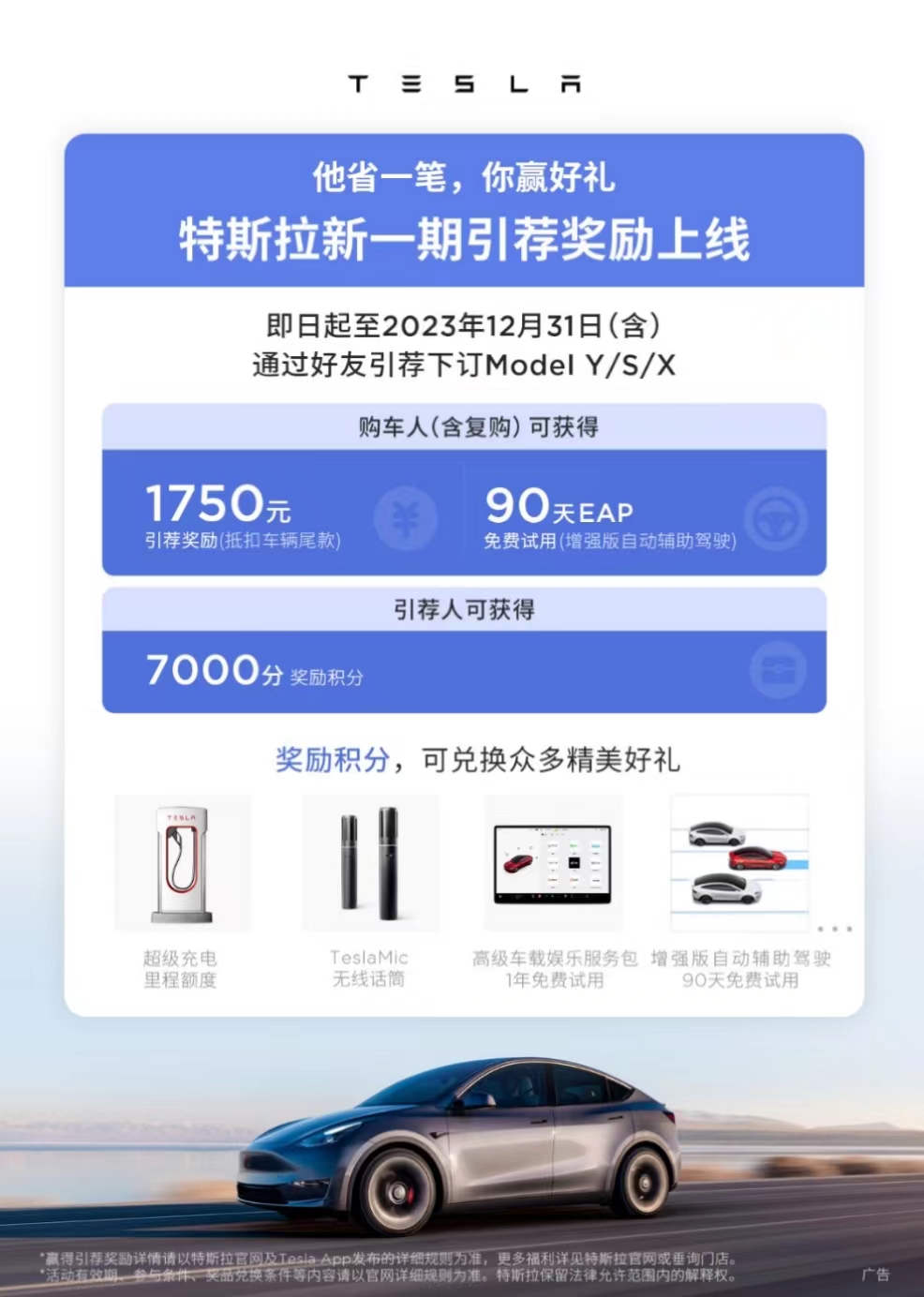 此外,11月1日起至12月31日,购车人通过好友引荐下订Model S/X/Y车型,并在订单有效期内提车,可获得1750元的购车尾款抵扣,以及90天增强版自动辅助驾驶功能免费试用;作为引荐人的老车主,成功邀请好友提走特斯拉,可获得7000积分奖励。