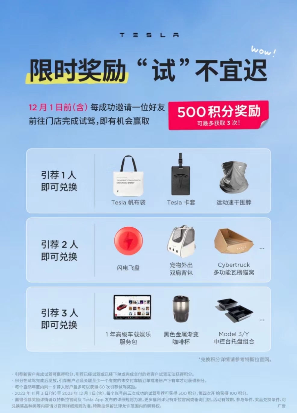 11月3日,特斯拉中国官网对引荐奖励的福利进行了调整。即日起至今年12月1日(含),特斯拉老车主每邀请一位好友前往门店完成任意车型试驾,即有机会赢取500积分奖励,且最多可获取三次。从第四次引荐试驾开始,可获取的奖励为100积分