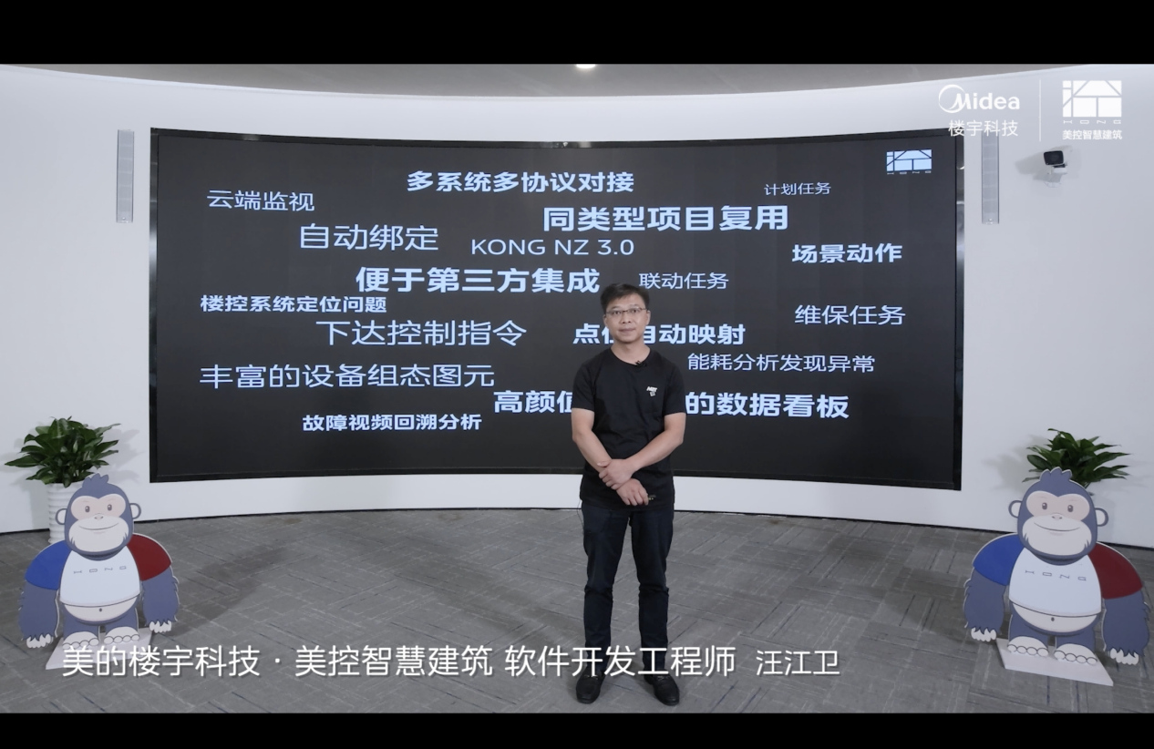 美的楼宇科技·美控智慧建筑软件开发工程师汪江卫在发布会上介绍全新升级的KONG-NZ零境系统3.0。边缘应用的软件工具,提供基础的人员管理、楼宇管理以及能源站能效控制等功能,可根据具体应用场景使用不同的功能块,包括单场景应用、多场景的综合应用。