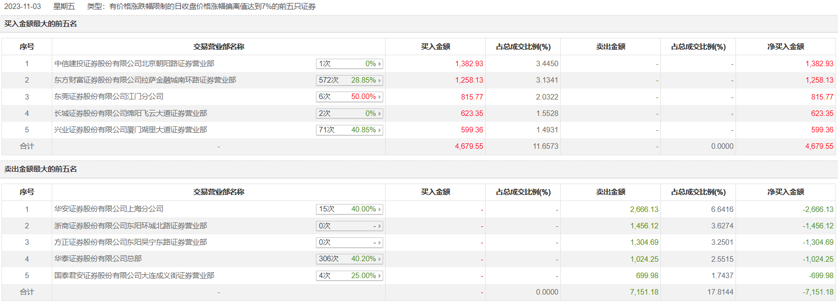 弘讯科技11月3日涨停,全天换手率达10.13%,振幅达9.47%。龙虎榜数据显示,营业部席位合计净卖出2471.63万元。其中,中信建投证券北京朝阳路证券营业部、东方财富证券拉萨金融城南环路证券营业部分别买入1382.93万元、1258.13万元;华安证券上海分公司、浙商证券东阳环城北路证券营业部分别卖出2666.13万元、1456.12万元。