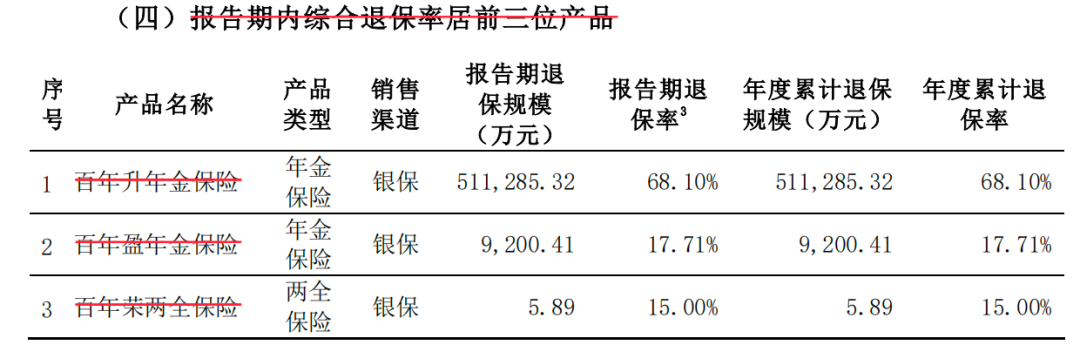 据百年人寿偿付报告显示,2023年公司综合退保率前三的产品分别为百年升年金保险、百年盈年金保险以及百年荣两全保险。其中百年升年金保险一季度累计退保51.13亿元,退保率为68.1%。