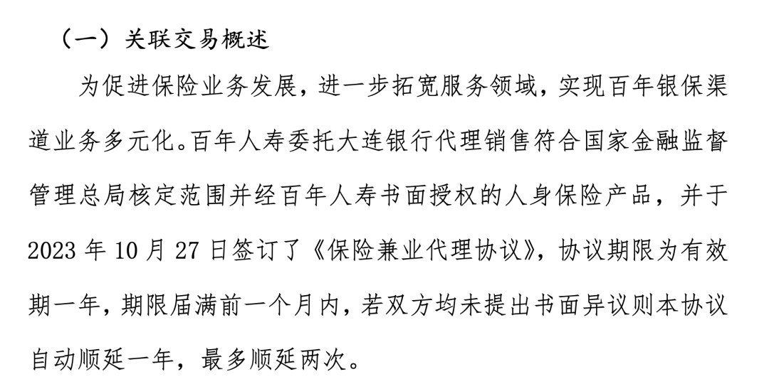 据百年人寿公告显示,10月27日公司与大连银行签订了《保险兼业代理协议》,委托大连银行代理销售百年人寿书面授权的人身保险产品,在协议有效期内,结合公司委托大连银行代销规模,百年人寿向大连银行三年支付代销手续费合计约 2000 万元。