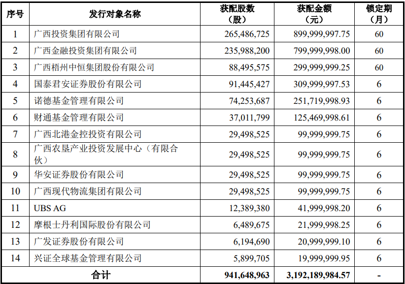 国海证券11月3日公告,定增募资总额31.92亿元,发行价格为3.39元/股,发行的发行数量为9.41亿股。公司控股股东、实际控制人广西投资集团及其控股子公司中恒集团、广西金投以现金方式认购国海证券本次向特定对象发行股票,其中广西投资集团承诺出资9亿元认购本次发行股份,中恒集团承诺出资3亿元认购本次发行股份,广西金投承诺出资8亿元认购本次发行股份。本次发行对象最终确定为14名,国泰君安获配3.10亿元,诺德基金获配2.52亿元。
