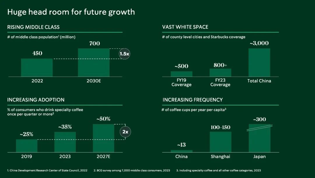“我们一直在报告我们进入的地级市的数量。”她说,四年前星巴克开始更积极地进入中国的县城。今后,星巴克将采取更加细化的方法,报告(进入)中国近3000个县级行政区的数量。据介绍,四年间星巴克已将业务从500多个县级行政区增加到800多个,她形容背后还有很多“空白点”。