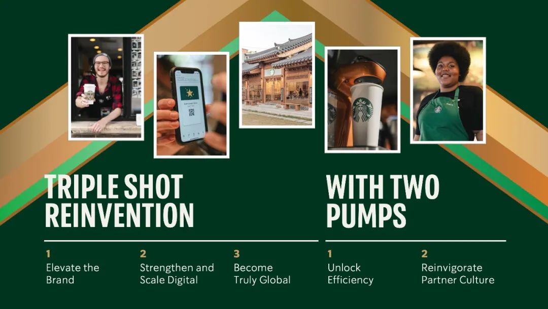 作为纳思瀚上任至今最重要的一次战略发布,他显然借用了一些咖啡行话(“Triple Shot Reinvention”和“two pumps”)对以下“3+2”规划进行了包装,具体包括: