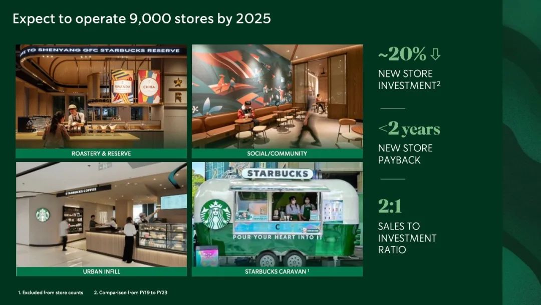 再次,是数字化。她透露,星巴克的外送业务就要成为一门收入10亿美元的生意,这里也有很多创新服务的空间,例如此前推出的星巴克“沿街取”服务。数字化的另一个关键部分是供应链。随着不断优化,目前劳动生产率提高了30%,浪费减少了50%以上,物流成本也得以大幅降低,总体而言门店的运营费用也下降了15%。最后,离不开持续的投资。王静瑛特别点名了最近的两个“大动作”,包括位于昆山的星巴克中国咖啡创新产业园,以及在深圳创立的星巴克中国创新科技中心,指这两项投资将继续提高生产力。至于在新店投资方面,小食代注意到,她透露随着店面设备和租金结构不断优化,星巴克新店投资成本(注:比2019至2023财年)减少了近20%,投资回收期不到两年,销售投资比(注:即年预期销售额与初始投资的比例)为 2:1。对于进入新城市,她说那里的门店表现始终优于市场平均水平。为此,星巴克的计划是每年在中国市场净开设近1000家新店,而新店能在现有门店的基础上带来“强劲的回报”,并继续带来强劲的盈利能力。