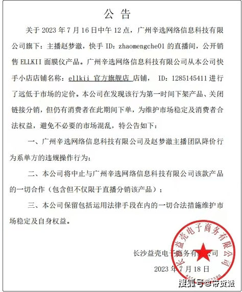 此外,今年7月18日,ELLKII品牌方也发公告中止了一款面膜仪产品与辛选的带货合作。品牌方益壳电子称,辛选主播赵梦澈以远低于市场的定价销售ELLKII面膜仪产品,属于单方的违规操作行为。为维护市场稳定及消费者合法权益,避免不必要的市场胡乱,中止与辛选关于该产品的一切合作。