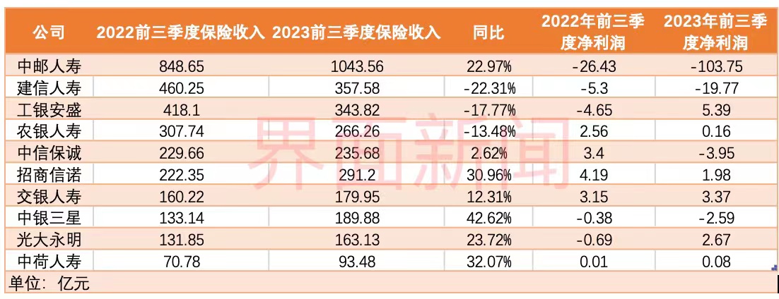 除了中邮人寿之外,另一家亏损规模破十亿的险企建信人寿,则出现了保费规模与利润双双下跌的情况。该公司今年前三季度实现保费收入357.58亿元,同比下跌22.31%;前三季度亏损19.77亿元,其中第三季度亏损16.54亿元。