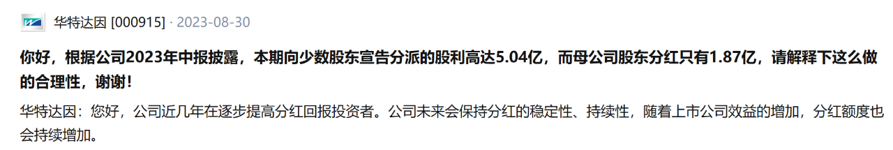 这一回答显然并不能让投资人满意。不差钱的华特达因为何给少数股东的分红,远远高于上市公司股东?这还需要公司的进一步解释。