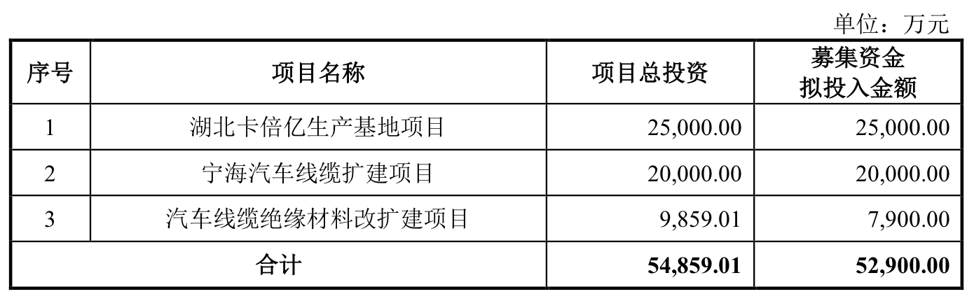那么此次卡倍亿的融资额为5.29亿元,拟投入项目3个:“湖北卡倍亿生产基地项目”、“宁海汽车线缆扩建项目”、“汽车线缆绝缘材料改扩建项目”,都与主营有关。