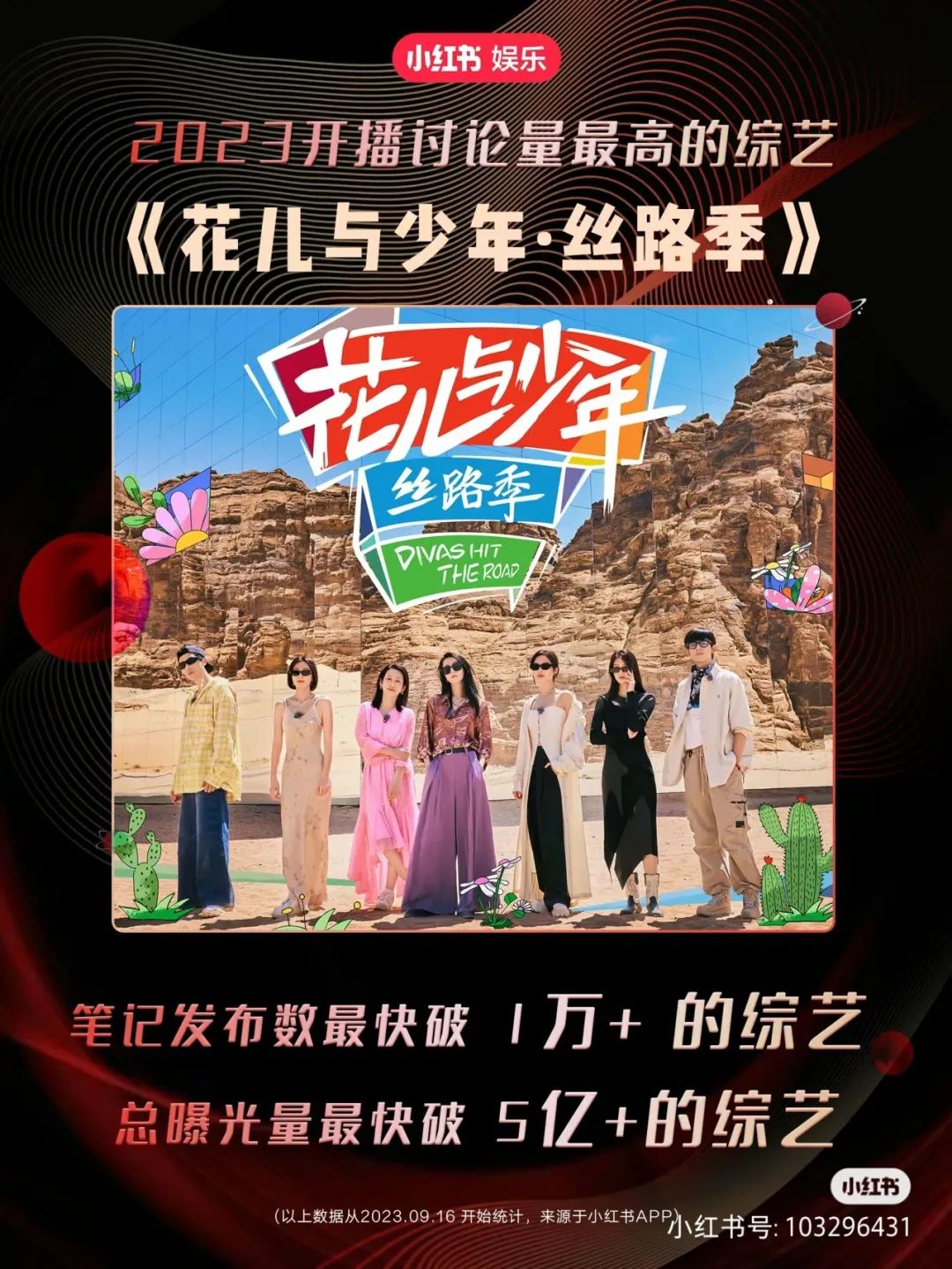 单账号涨粉之外,热播影剧综在小红书拥有极高的讨论度。根据新红数据,随着《狂飙》《长相思》的热播,小红书平台同名话题总浏览量分别高达57亿、34亿,电影《孤注一掷》同名话题也高达12亿。10月30日,小红书官方娱乐号「娱乐薯」发布笔记,宣布《花儿与少年·丝路记》笔记破万,成为小红书2023开播讨论量最高的综艺。