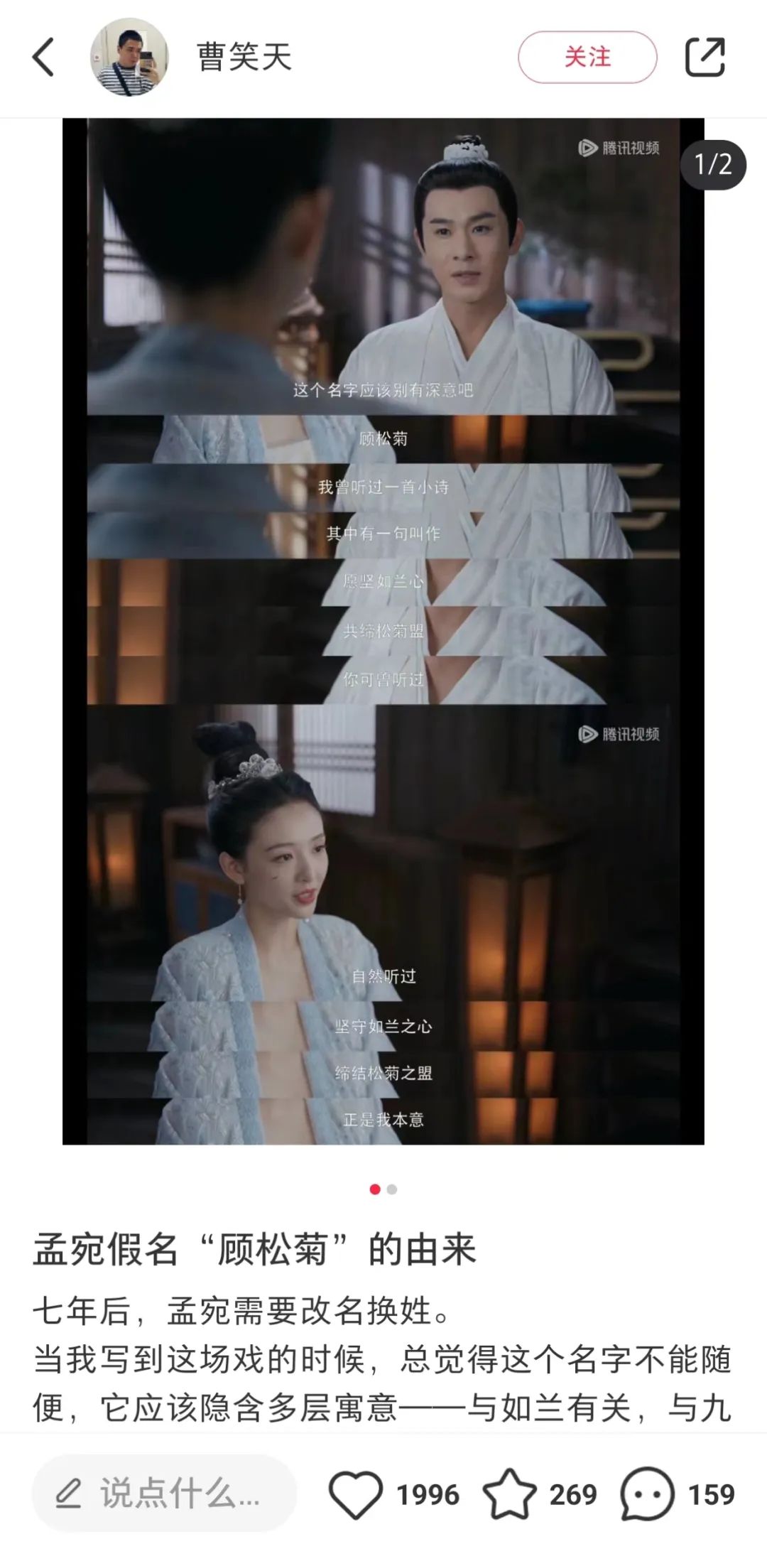 曹笑天还发布多篇贴文讲解主角孟宛假名「顾松菊」的由来——七年后复仇归来的孟宛需要改名换姓,曹笑天一直没有灵感,在抓耳挠腮之际读到宋朝尚书郎卫宗武「愿坚如兰心,共缔松菊盟」,深觉寓意很符合主题。又如,第十集某个镜头里有三块牌匾,是曹笑天夹带私货,致敬《三块广告牌》,点出《九义人》的故事跟《三块广告牌》都是一个坚毅女人为一个枉死女孩伸冤的故事。