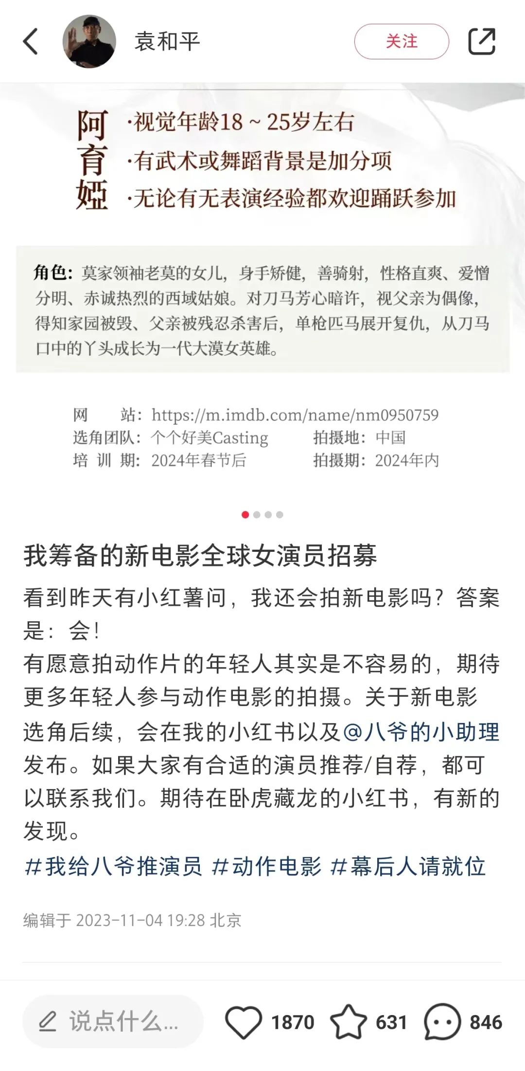 9月,小红书官方发起「幕后人请就位」活动,11月,袁和平入驻小红书,并发布笔记,为自己的新电影《镖人:风起大漠》进行全球女演员招募。