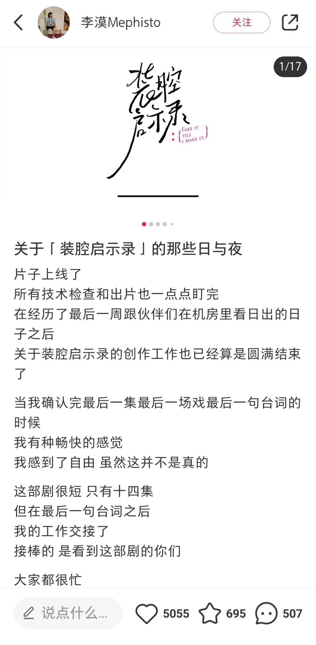 《装腔启示录》播出期间,包括导演、作曲、美术、妆造等在内的多位主创都入驻了小红书。小红书甚至成为导演李漠重点关注的平台,剧播期间他发布多篇图文分享拍摄过程中的轶事。在「关于《装腔启示录》的那些日与夜」这篇笔记下,评论点赞最高的那条说道:「我在意的是,导演别太懂小红书,还加了宝宝辅食(标签)。」