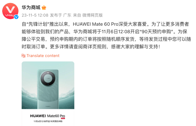 11月5日,华为商城发布消息称,为了让更多消费者能够体验到华为Mate 60 Pro,华为商城将于11月6日12:08开启“90天预约申购”。为保障公平交易,预约申购期内的订单将按照随机顺序发货,等待发货过程中消费者可以随时取消订单。