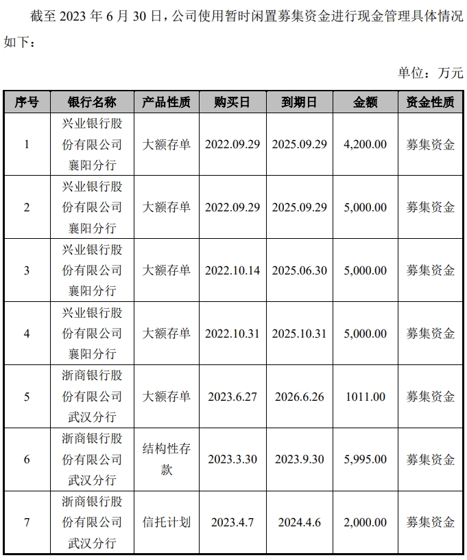 其中,在兴业银行襄阳分行以大额存单形式存放共计1.92亿元,浙商银行武汉分行大额存单1011万元,结构性存款5995万元,信托计划2000万元。
