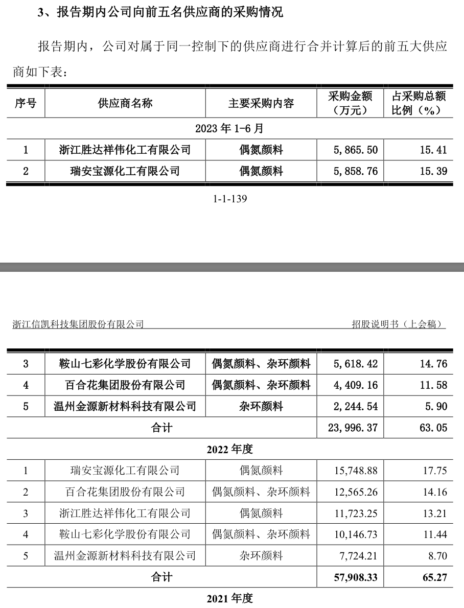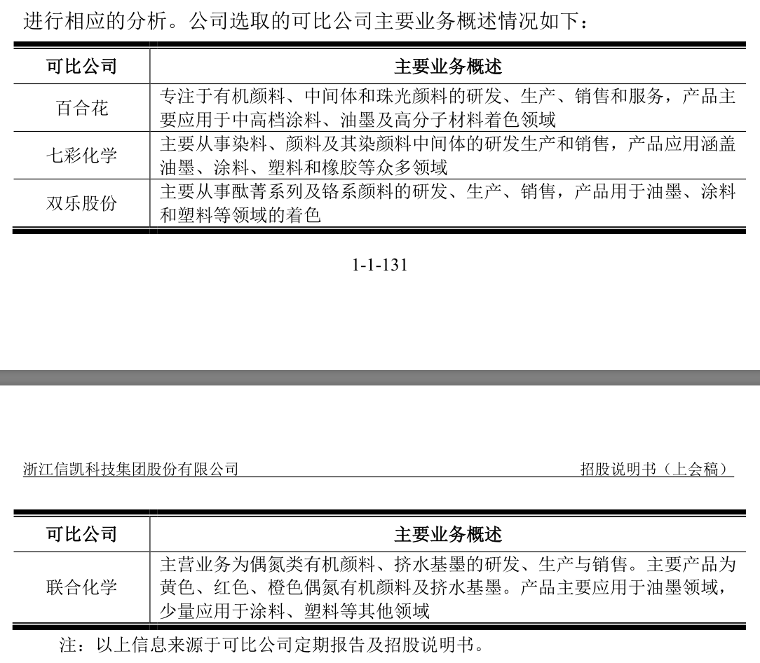 值得注意的是,信凯科技的前五供应商名单中,就有行业可比对手七彩化学、百合花。