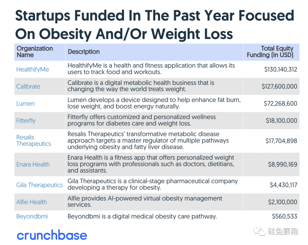 据Crunchbase数据显示,去年全球减重和肥胖管理类公司的融资总额就达到了快4亿美元,包括将用户与营养类医师相联结的数字平台、让用户记录和监测饮食和运动的app、治疗肥胖靶向药的开发商、还有可帮助燃脂和增加精力的智能设备等等