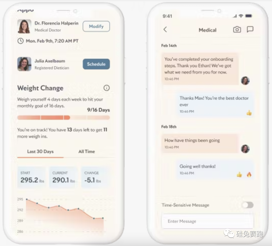 还有像是通过专注于代谢健康帮助减肥的平台Calibrate提供用户与医生间一对一的指导,虽然也会为用户开减肥药,但更注重在饮食、锻炼、睡眠和情绪等多个方面提供计划和建议,通过全套生活方式指导进行长期体重管理,目前平台上的用户大多为45岁以上的女性,数据显示其会员在Calibrate的帮助下每年能够平均减重14%。Calibrate在过去三年内完成了1.27亿美元融资,Founders Fund和Tiger Global Management在2021年领投的1亿美元B轮让其估值直接达到了3.65亿美元。