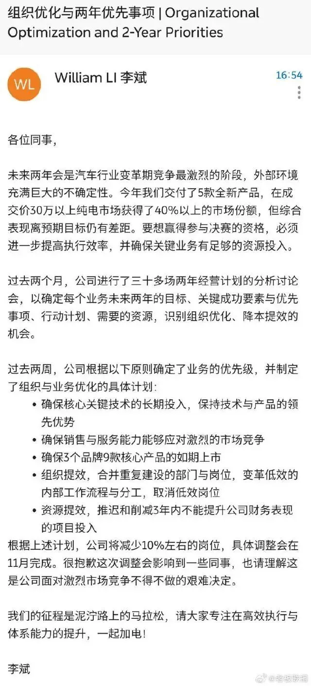 临近年底,李斌再发全员信,强调削减的部门主要涉及低效和业务重复的部门,并推迟和削减3年内不能提升公司财务表现的项目投入。