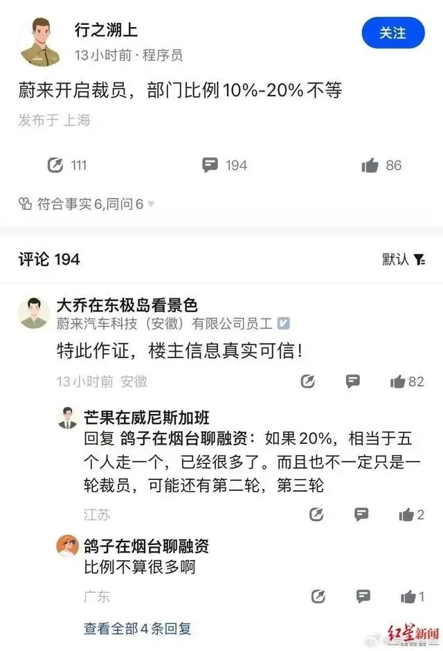 有人在网间发文称,蔚来将开启裁员,部门比例10%到20%不等。