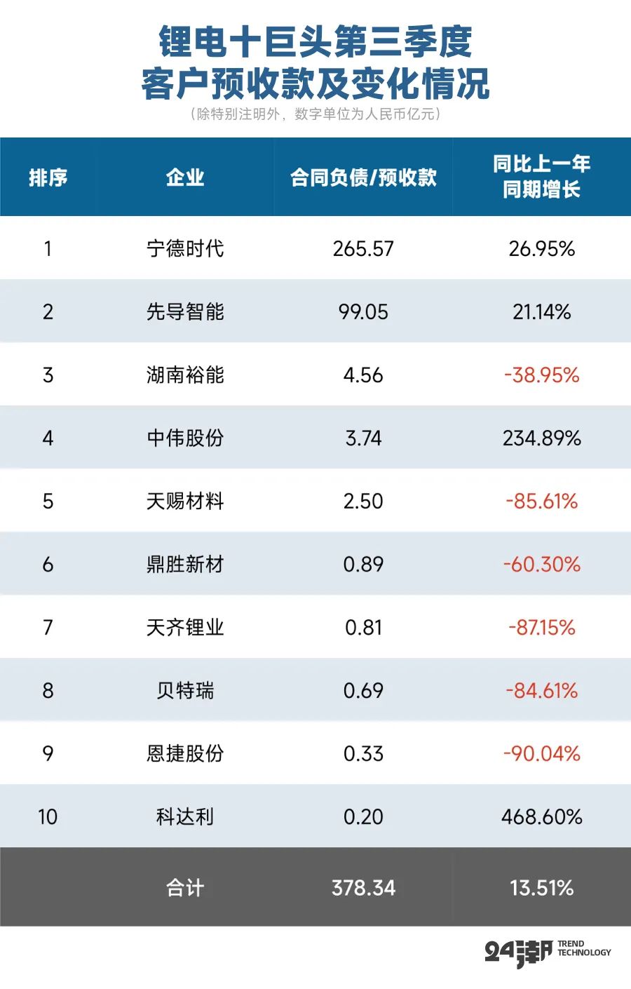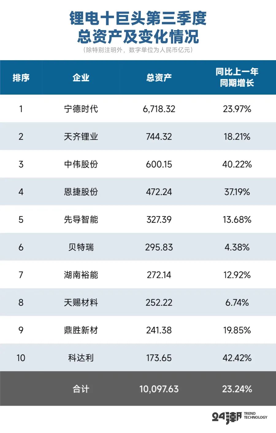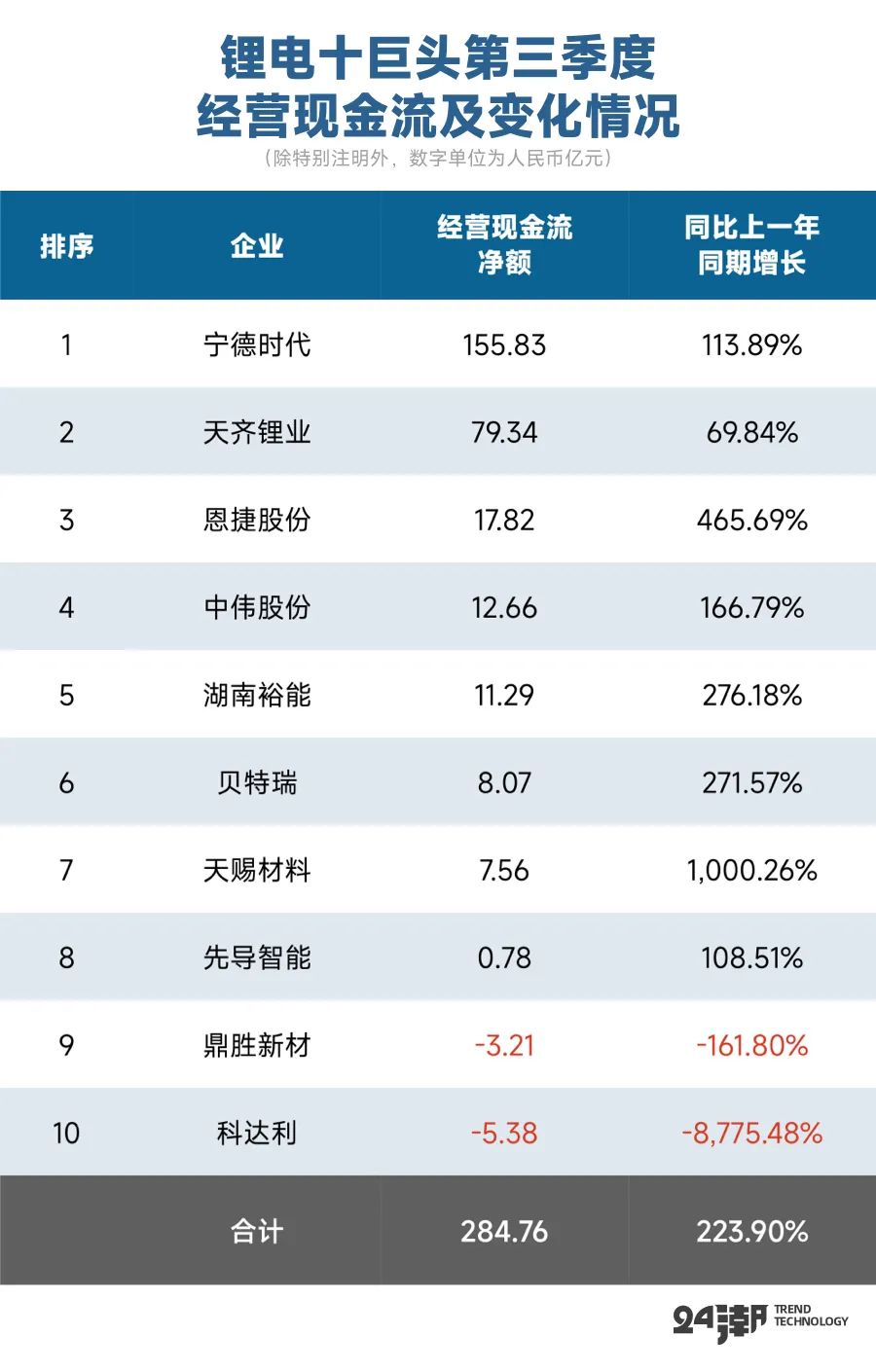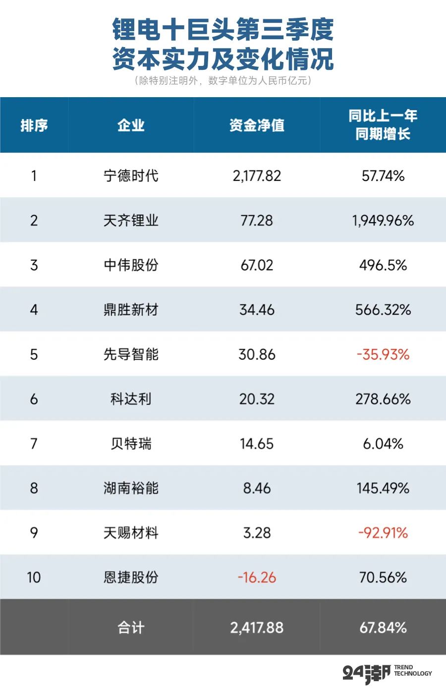 本期内容,24潮统计了锂电十巨头第三季度十几项核心数据及变化,涵盖营业收入与客户预收款、净利润、对外投资、造血与筹资力、总负债与资产负债率、资金净值、应收账款与存货、等,全面展现巨头间整体的竞争格局,以及在产业剧烈变化中企业面临的压力与挑战,供读者朋友参考。