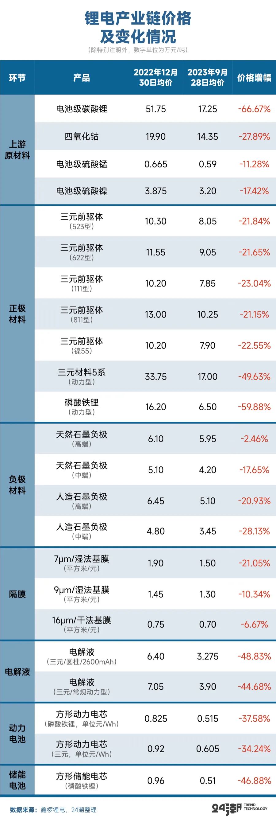 事实上,前三季度锂电全产业链价格的暴跌,已经展现了极为严峻的产业竞争环境与发展趋势,比如前九个月动力电池价格降幅超30%,储能电池价格降幅超46%,电解液降幅超40%,电池级碳酸锂降幅甚至超过66%等,尤其第三季度(7-9月)部分产业链价格再次呈现加速下跌趋势,详见下表: