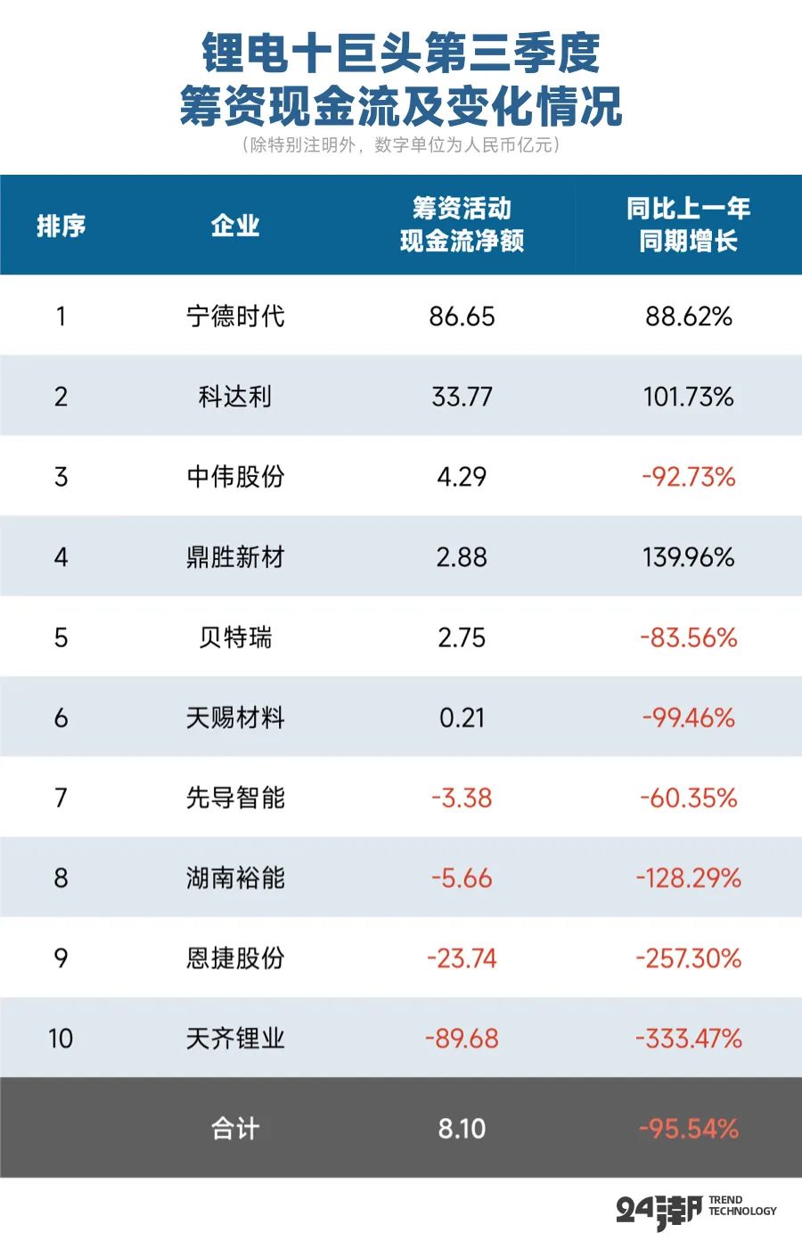此外,第三季度锂电十巨头净筹资(筹资活动现金流净额)规模仅为8.1亿元,同比下降了95.54%,其中天齐锂业、恩捷股份、湖南裕能和先导智能为负值,筹资现金流处于净流出状态。