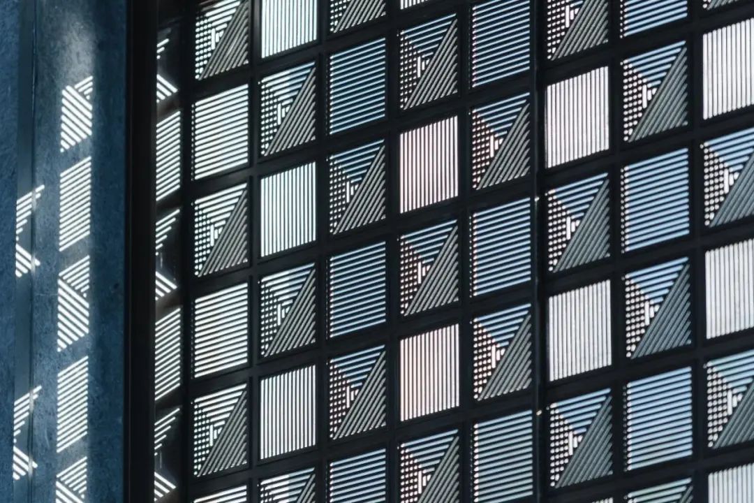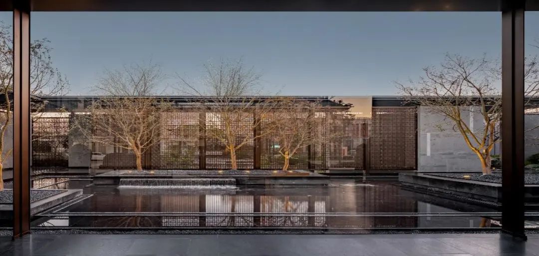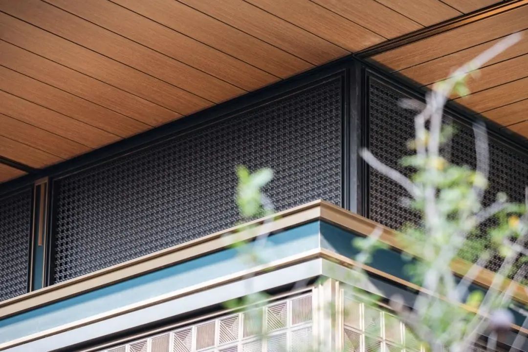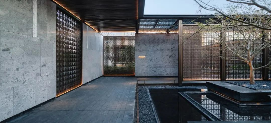 厅堂和轩堂,也在这番赏景过程中,毫不突兀地依次出现。前者还原出孔子树下讲学的场景,后者则用金属编织的卷帘搭配青绿色彩釉玻璃,构建出一个品茗厅琴的空间。这一切来得如此自然、连贯,富有节奏和层次,把园林艺术的本质抓得入木三分。
